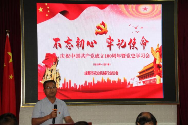 为了深入贯彻中共中央关于庆祝中国共产党成立100周年,广泛开展学党史、新中国史、改革开放史、社会主义发展史宣传教育的通知精神。成都市农业机械行业协会于2021年6月24日在新都区川视宝光宾馆召开了庆祝中国共产党成立100周年暨党史学习会。协会理事会主要成员和协会党员会员参加了庆祝会。