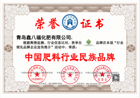 近日,由中国管理科学院行业发展研究所、中国市场学会流通专业委员会、中国行业领先品牌企业推介活动组委会等多家单位联合举办的第十一届“行业领先品牌暨创新标杆企业宣传推介”,活动中青岛鑫八福化肥有限公司注册的品牌“鑫八福”被评选为中国肥料行业民族品牌!