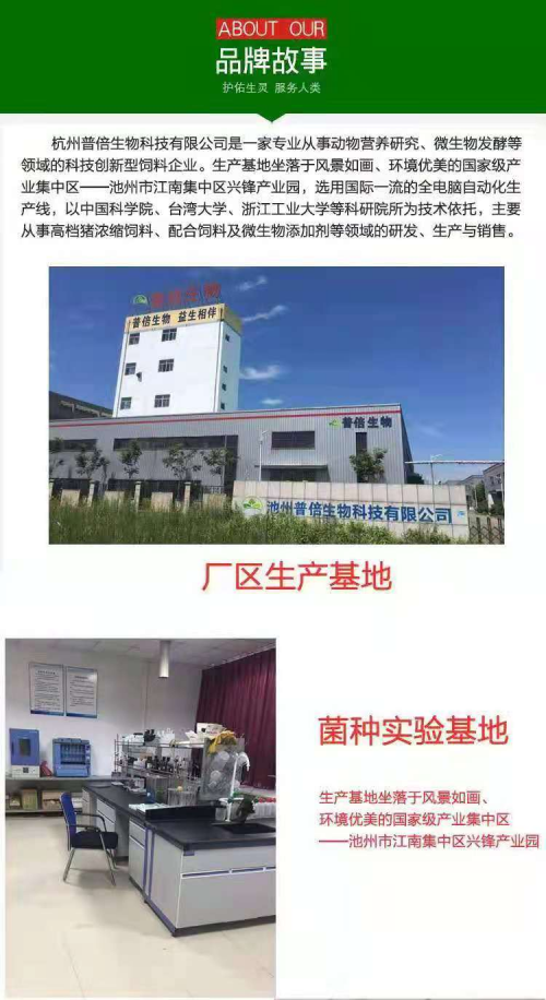 积极承担社会责任是优秀企业一贯品质,杭州普倍生物科技有限公司是一家专注于动物营养、微生物发酵等领域的科技创新型企业,主要从事高档微生态饲料及微生态饲料添加剂的研发、生产与销售。养殖行业直接关系群众的餐桌安全,饲料禁抗是全球大势所趋。普倍生物早在多年前,就专注于动物抗病营养和无抗替代技术开发,通过利用微生态技术,改善动物肠道菌群平衡,提高动物采食量和机体免疫力。
