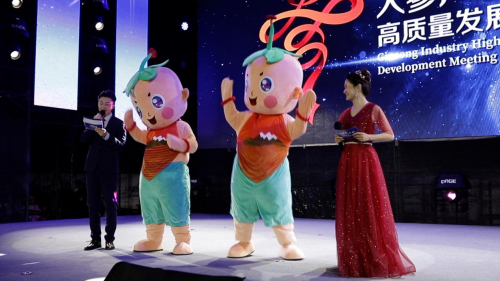 9月19日,大会开幕前夕,抚松县举办“传承弘扬人参文化,打造‘林海参乡’品牌”人参嘉年华活动。现场发布“参团团”为大会吉祥物。“参团团”形象是一个可爱的人参娃娃,头顶红色参籽正在奔跑,展示了抚松“人参之乡”的生机和活力,也体现着长白山采参习俗这一传统文化。发布红丝带构成的“参”字形象为本次大会会标。会标将意象化的汉字“参”与“乡”巧妙结合于一体,寓意本次大会红红火火,推动人参全产业链标准化、市场化、现代化建设的决心。