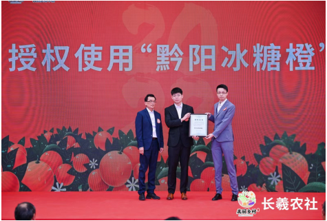 精彩的圆桌会分享之后,就迎来了激动人心的环节,洪江市农业农村局四级调研员杨宏庆亲自为长羲农社颁发“黔阳冰糖橙”授权证书,在全场嘉宾的见证下,长羲中济数字农业公司董事长李锋淅及董事蒋育霖,一起上台接收授权书,完成这一历史时刻。