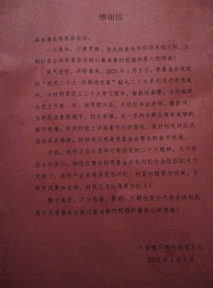 为推动学习宣传贯彻党的二十大精神往深里走、往心里走、往实里走,推进农村精神文明建设,关爱海南乡村尤其革命老区、黎村苗寨的群众生活,海南惠农慈善基金会传承初心使命,立足自身宗旨,在海南省农业农村厅、海南省民政厅的共同指导下,联合海南农信三农社区义工服务社,共同发起“欢庆二十大 送福进农家”献礼二十大系列公益活动。在相关部门的关心与支持下,活动画上了圆满句号。