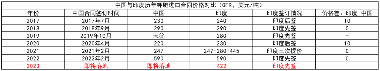 2023年4月4日,印度的钾肥年度大合同终于敲定,印度进口商IPL与加拿大钾肥联盟Canpotex及俄罗斯乌拉尔钾肥公司分别签订了2023年年度钾肥大合同,签订价格为CFR422美元/吨。印度大合同的签订使得市场对于钾肥价格不确定性消除,国际钾肥价格企稳。