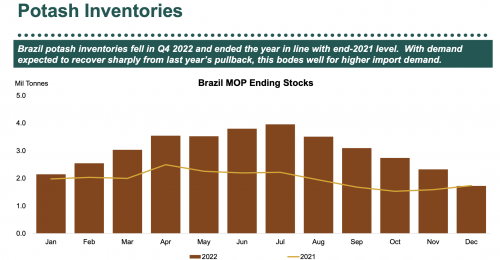 一是全球主要农业大国处于低库存待补充库存阶段。根据美盛(Mosaic)2023年2月数据显示,2022年底巴西钾肥库存已下降至不足200万吨,较俄乌冲突阶段大幅回落。同时,2023年3月巴西钾肥进口量达112万吨,同比提高28%。加钾Nutrien表示印度处于钾肥库存紧张状态,荷兰化肥公司OCI同样表示印度需要在2023年补充化肥库存。中国地区由于有俄及白俄通过铁路运输补货库存相对充裕,但4月白俄钾BPC若暂停对国内供货,则国内钾肥库存承压。