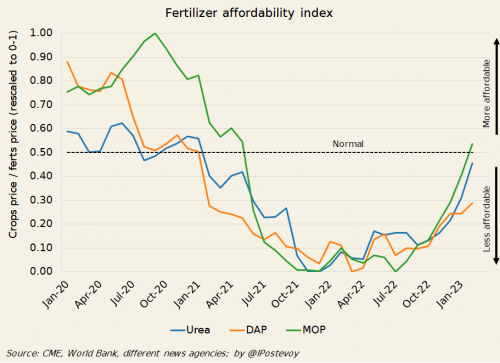 二是价格回落已回归至农民可负担水平,使得需求量提升。研判化肥需求状况的一个有效切入点是跟踪作物价格与化肥价格的比率,即 “可负担性”。这一比例越高农民越有利,农民更愿意通过提高化肥的施用量方式保障作物产量以增加收入。由图可见,自2021年底,因白俄罗斯受制裁及俄乌冲突导致化肥尤其是钾肥价格飙升,但农民对于钾肥的可负担性降低,抑制了部分需求,从2022年四季度钾肥价格回落,农民的可负担性开始明显提升,农民的经济情况显著改善,钾肥需求量稳定提升,从趋势来看,钾肥的可负担性已达到了正常水平。
